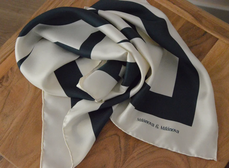 Crafted from luxurious silk twill sourced from the shores of Lake Como, this scarf embodies timeless elegance. The silk scarf features elements in Trapped Darknessa dark, deep blue, elegantly layered over a background in Pearl Dusta soft and lustrous off-white tone. The combination creates a striking contrast that is both refined and captivating.
