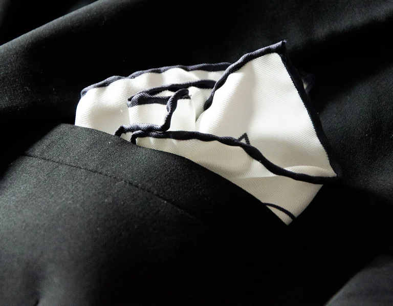 Presentamos nuestro exquisito pañuelo de bolsillo, elaborado con precisión y sofisticación. La elegancia atemporal de un fondo blanco se encuentra con el atractivo clásico de los triángulos azul marino, creando un diseño que irradia refinamiento. Hecho de 100% seda twill, este pañuelo de bolsillo ofrece una sensación lujosa y un sutil brillo. Los bordes enrollados a mano añaden un toque de acabado meticuloso, destacando nuestro compromiso con la calidad artesanal. Eleva tu atuendo con este accesorio excepcionalmente elegante, una combinación perfecta de estilo y sofisticación.